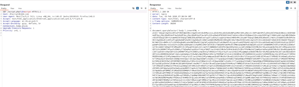In addition to the obfuscated HTML, it also contains some JavaScript at the end that has a small decryption function to hide the URL for the next stage. The captcha image contains the key to decrypt (xor) the Base64-encoded string. Interesting fact: The Base64 string and the captcha image change with every request, and the URL for stage 2 changes every 5 minutes.