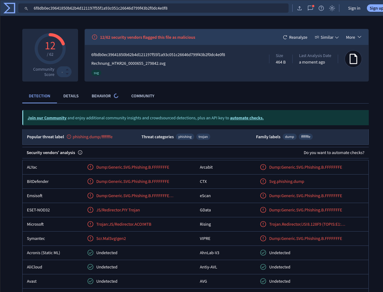 The SVG attachment is quite small, not obfuscated at all, and is already detected by some AVs: https://www.virustotal.com/gui/file/6f8db0ec39641850b62b4d121197f55f1a93c051c26646d799f43b2f0dc4e0f8?nocache=1